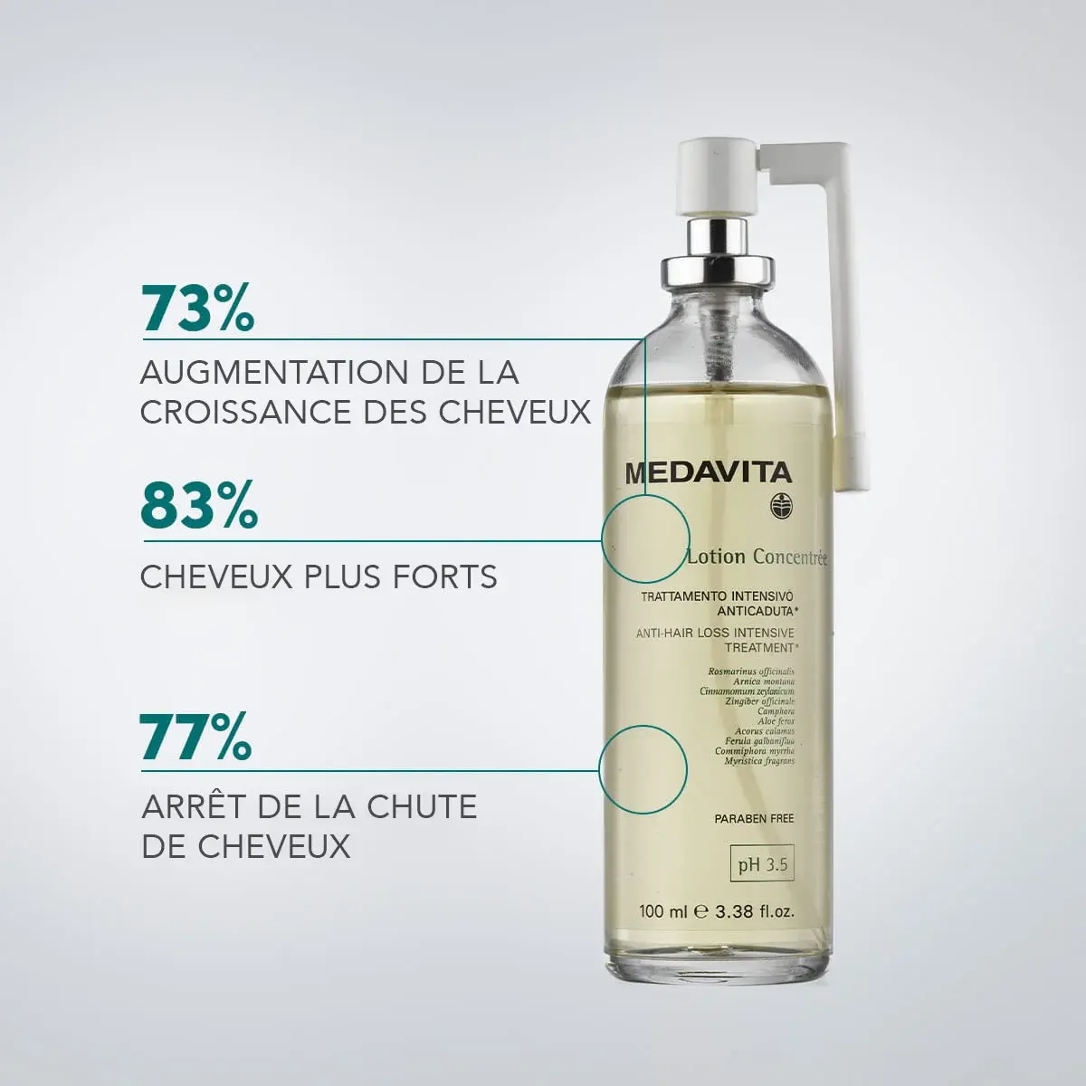 Le Medavita Lotion Concentrée Traitement Intensif Anti-Chute est un soin ciblé pour lutter contre la chute des cheveux, particulièrement adapté aux cheveux affaiblis et en phase de chute avancée. Ce traitement intensif agit en stimulant la microcirculation du cuir chevelu et en inhibant les enzymes responsables des modifications qui provoquent la chute des cheveux. Grâce à une formule exclusive, cette lotion permet de prolonger la vie du cheveu, favorisant ainsi la repousse et renforçant l’ancrage du cheveu au follicule.