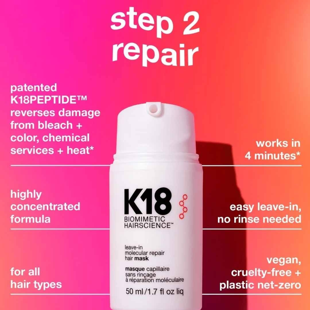 • K18 at-home discovery duo with detox shampoo and molecular repair leave-in mask, perfect to reset buildup and strengthen hair from within.