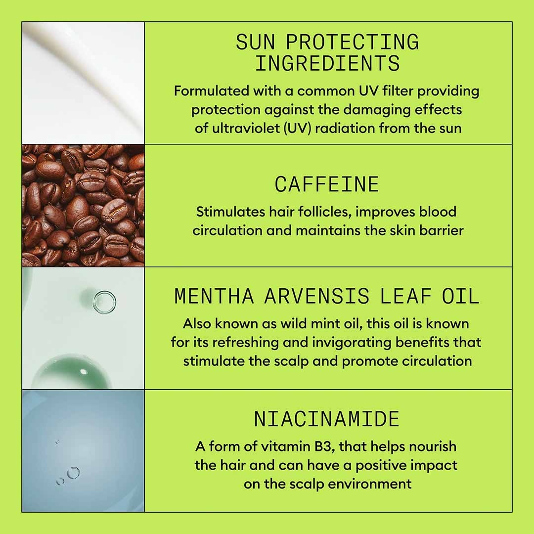 Aqua/Water/Eau, Niacinamide, Phenylbenzimidazole Sulfonic Acid, Caffeine, Polysorbate 20, Benzophenone-4, Phenoxyethanol, Sodium Benzoate, Benzyl Alcohol, PEG-12 Dimethicone, Sodium Hydroxide, Cocamidopropyl Betaine, Acetamide MEA, Propylene Glycol, Tetrasodium EDTA, Methyl Nicotinate, Mentha Arvensis Leaf Oil, Parfum/Fragrance, Polysorbate 80, Polysorbate 60, PEG-23M, Mentha Piperita (Peppermint) Oil, Limonene, Camellia Sinensis Leaf Extract, Cystine Bis-PG-Propyl Silanetriol, Tocopheryl Acetate, Lecithin, Biotin, Citrus Paradisi (Grapefruit) Peel Extract, Humulus Lupulus (Hops) Flower Extract, Urtica Dioica (Nettle) Leaf Extract, Silica, Citric Acid, Vaccinium Myrtillus Leaf Extract, Acer Saccharum (Sugar Maple) Extract, Citrus Limon (Lemon) Peel Extract, Saccharum Officinarum/Sugar Cane Extract/Extrait de canne à sucre, Faex Extract/Yeast Extract/Extrait de levure, Propylparaben, Citrus Aurantium Dulcis (Orange) Fruit Extract, Potassium Sorbate, Maltodextrin, Methylparaben, Ethylparaben, Butylparaben, BHT